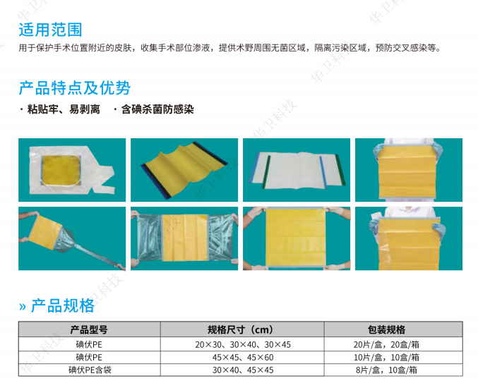 用于保护手术位置附近的皮肤,收集手术部位渗液,提供术野周围无菌区域,隔离污染区域,预防交叉感染等。